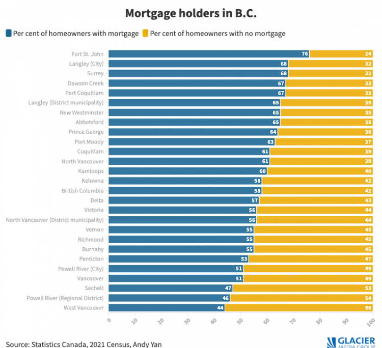 The three communities in B.C. with the highest percentages of mortgage holders are Fort St. John, the City of Langley and Surrey. Fort St. John has by far the highest proportion of mortgages, with 76 percent of homeowners being mortgage holders. In comparison, only 44 percent of West Vancouver homeowners have a mortgage, the lowest percentage in the province. The regional district of Powell River is second with 46 percent and Sechelt is third with 47 percent.