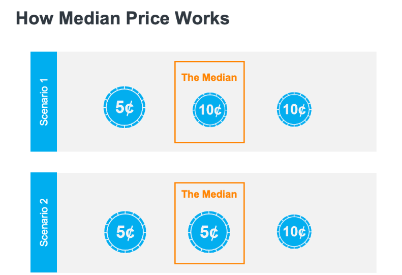 To drive this point home, here's a simple explanation of the median value (see visual below). Let's say you have three coins in your pocket, and you decide to line them up according to their value from low to high. If you have one nickel and two dimes, the median value (the middle one) is 10 cents. If you have two nickels and one dime, the median value is now five cents.